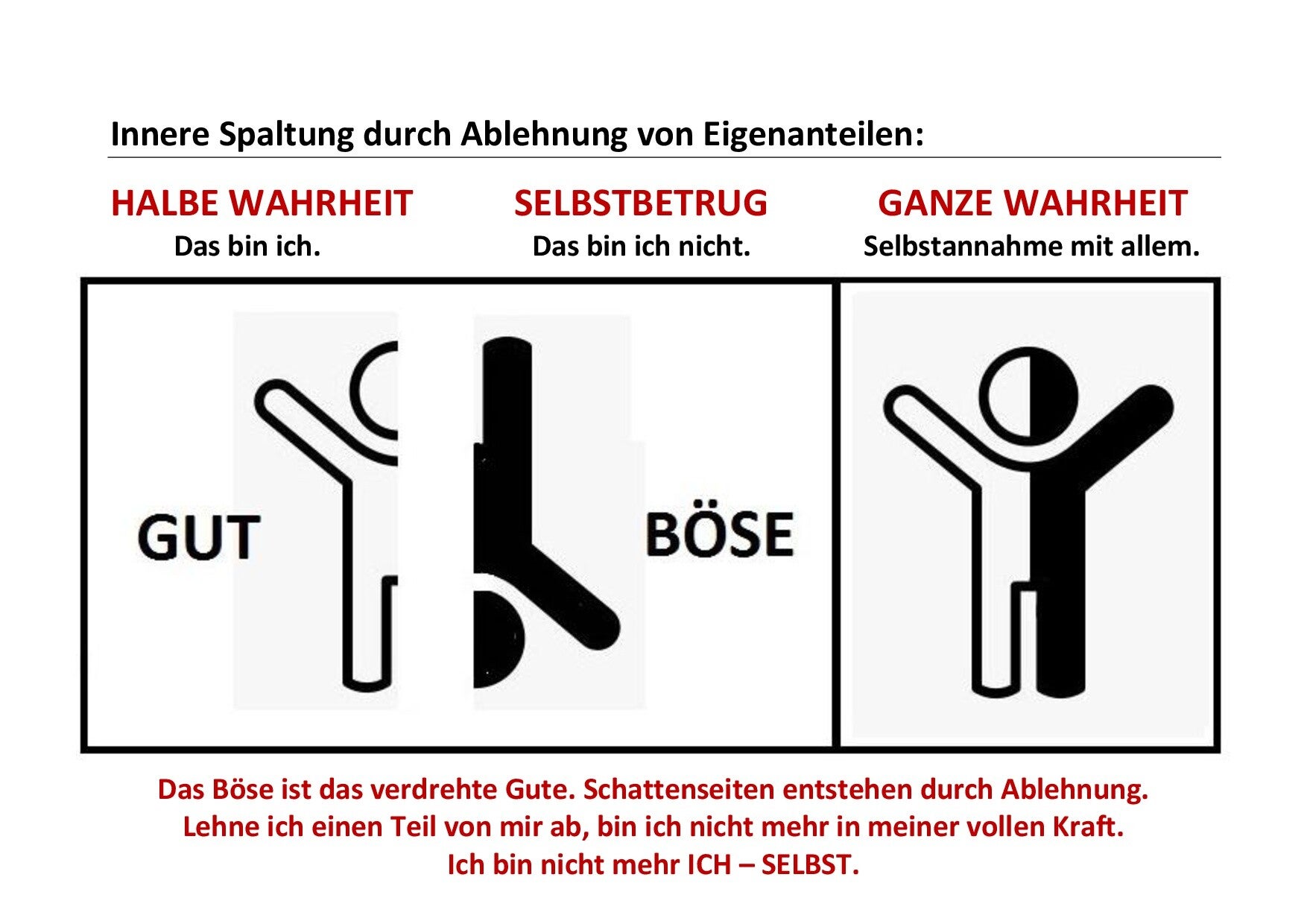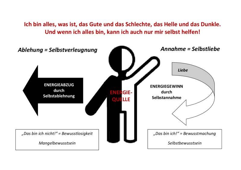 Man sagt, wir alle haben unsere positiven und negativen Seiten, wobei diese Wertung schon falsch ist. Wirklich negativ ist nur, was nicht angenommen werden kann. Das Schlechte ist das verdrehte Gute, das durch Ablehnung ins Gegenteil verkehrt wird.
